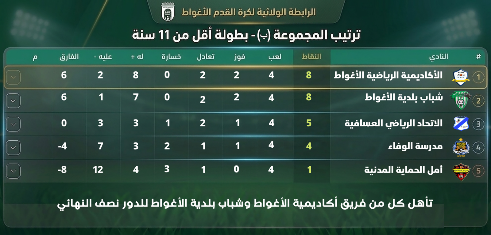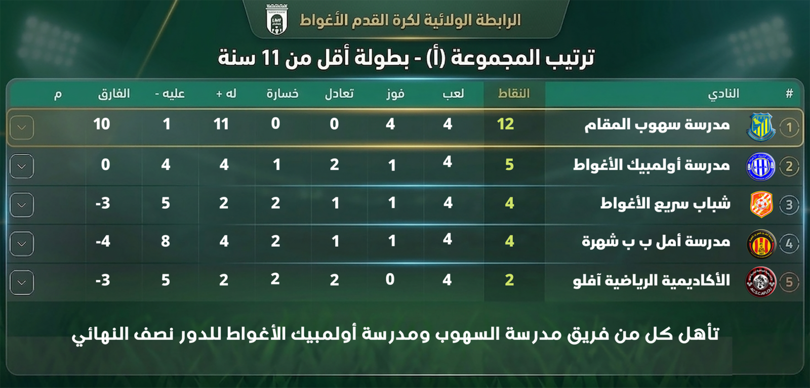 تجسيداً لشعار "براعمنا اليوم.. نجومنا غداً"، وفي إطار استراتيجيتها الرامية لتطوير كرة القدم من القاعدة وصناعة أبطال المستقبل، أشرفت الرابطة الولائية لكرة القدم بالأغواط صبيحة اليوم على انطلاق تصفيات دوري المجموعات لبطولة فئة أقل من 11 سنة.