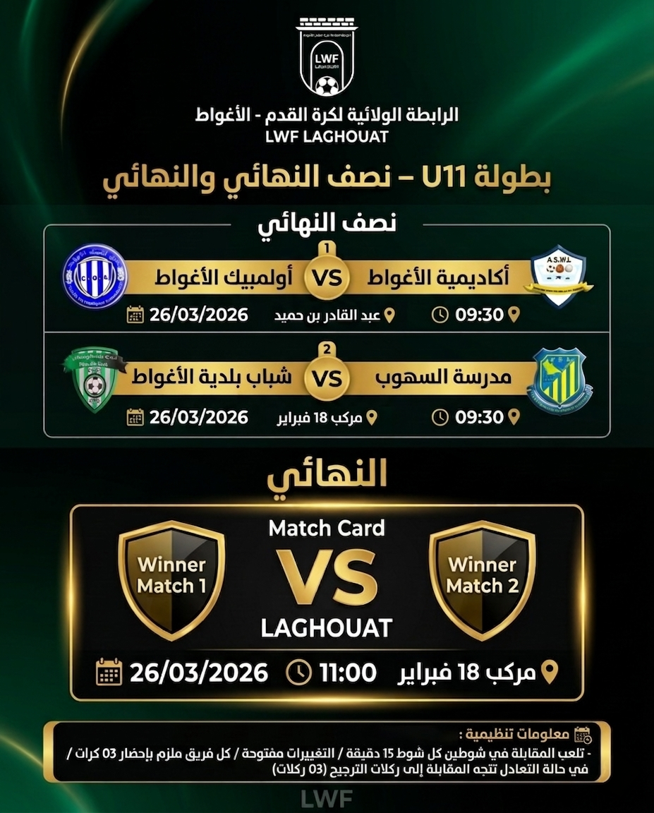 كلمة الرابطة: "إننا نؤمن بأن الإبداع يبدأ من هنا، ومن هذه الملاعب ستتخرج الأسماء التي سترفع راية الكرة الأغواطية والوطنية مستقبلاً. كل التوفيق لمواهبنا، أنتم فخرنا وأملنا القادم."